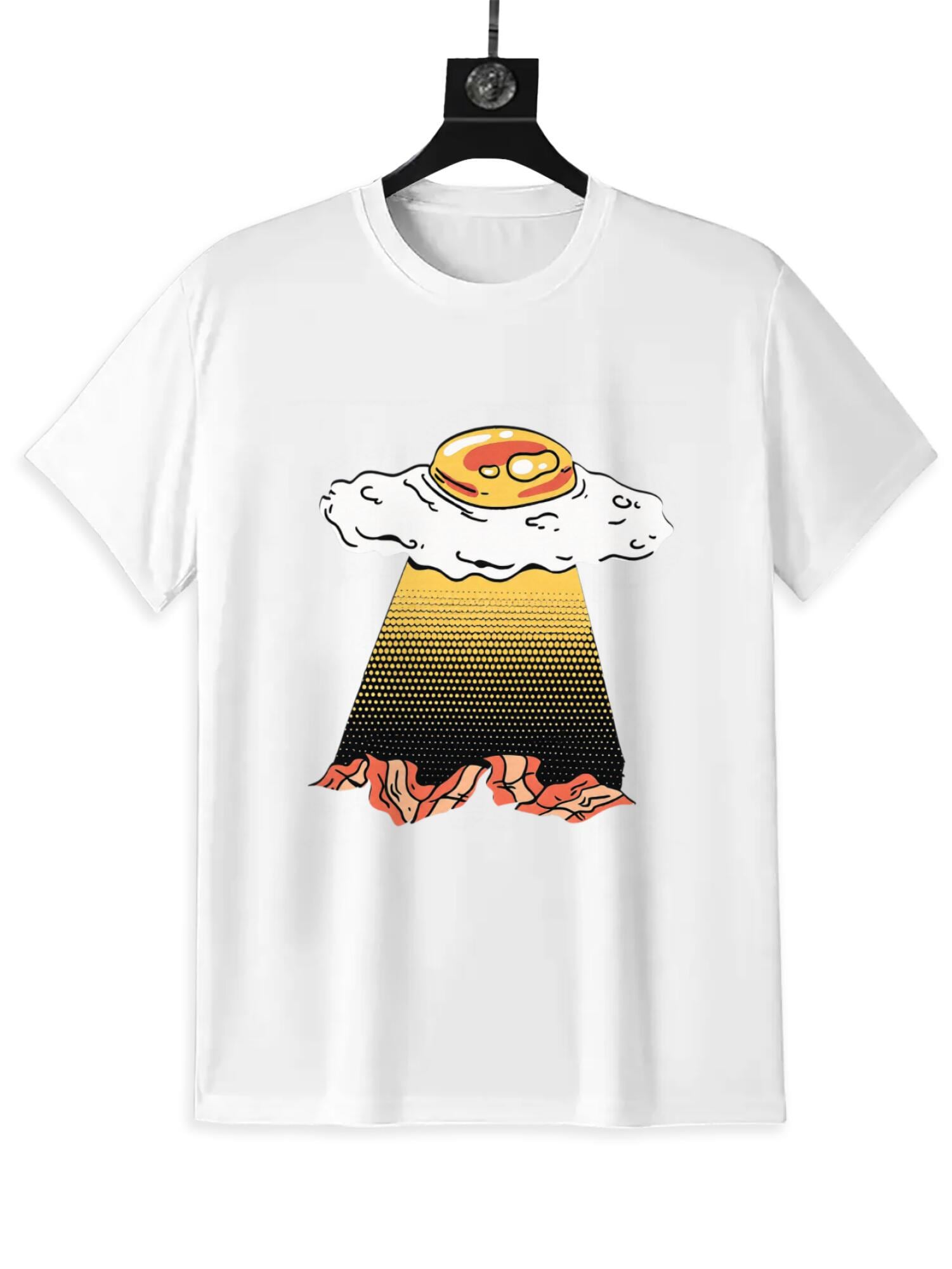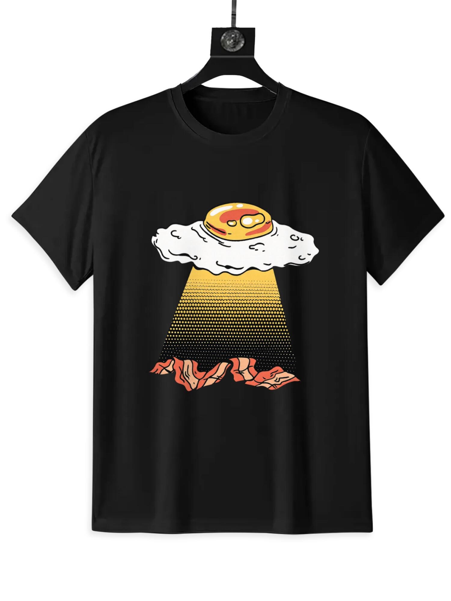 Add a playful twist to your casual style with this UFO Fried Egg and Bacon graphic T-shirt!